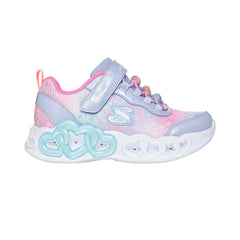 Sparkle and shine in magical delight wearing Skechers Heart Lights® Infinite Heart Lights - Heart Jewels. This Skechers adaptive closure design features a heart-and-star print sparkle mesh upper with synthetic overlays, fixed stretch laces with heart charms, an adjustable instep strap, and a sculpted light-up midsole with 'heart chain' detail.