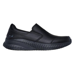 Stay safe and comfortable all day long in the easy-wearing Skechers Work? Slip-Resistant Relaxed Fit?: Squad Chaos - Rockrath. This slip-resistant loafer style features a smooth, laceless leather upper with a cushioned Skechers Air-Cooled Memory Foam? insole.